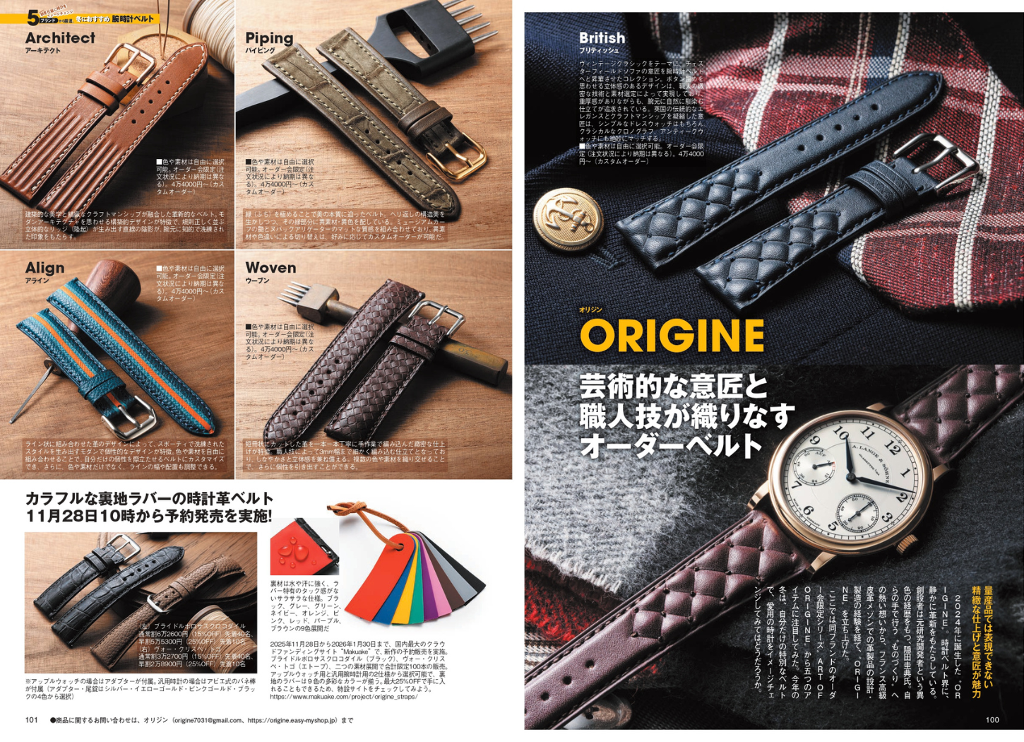 誌面では、ORIGINEの代表的なデザインである 「British」 をはじめ、独自の構造とデザイン性を備えたストラップコレクションが紹介されています。